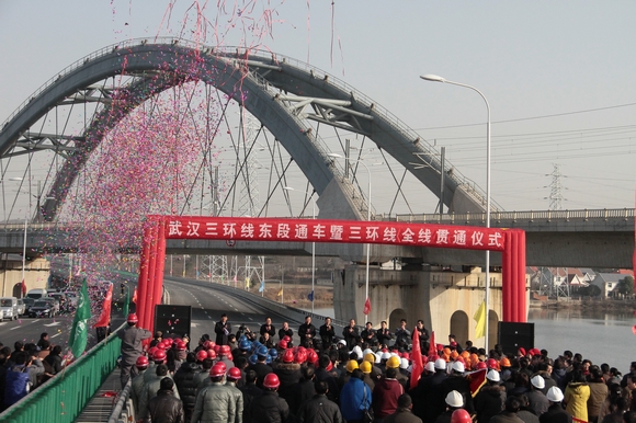 2010年12月30日,三環(huán)線東段暨全線正式通車,形成武漢市內首條全線通車的快速環(huán)線通道。市政府在三環(huán)東段起點舉行了隆重的通車慶典,武漢建工的彩車載著武建人的喜悅和自豪行使在慶典的車隊之中,沿著寬闊和通暢的道路向前奔馳。